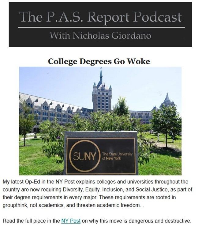 Are we witnessing changes that will spell the demise or our American values, those principles of equality spelled out in our Constitution and the Bill of Rights? I invite you to read this op-ed from Prof. Nicholas Giordano in NYP. I believe it is time that we speak out to preserve our founders' values as expressed in both the Declaration of Independence and our Constitution of the United States, neither of which supports inequality (equity) or any other form of preference or favoritism toward any person based on race or heritage. Remember the words of Ronald Reagan who warned that ours may be one generation away from extinction by those who fail to remember these values. Are we this generation, and are we now experiencing exactly that of which he warned? Click HERE or on the image to read Nick's article in NY Post.
